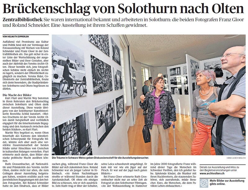 "Auffallend viel Prominenz aus Kultur und Politik fand sich zur Vernissage der Fotoausstellung mit Werken von Roland Schneider und Franz Gloor in der Zentralbibliothek ein. Das galt sicher in erster Linie der Wertschätzung der ausgestellten Bilder und ihrer Gestalter, aber auch der Aktivität des Vereins Archiv Olten. Dieser bemüht sich, jene fotografischen Schätze nicht einfach im Archiv zu lagern, sondern der Öffentlichkeit zugänglich zu machen."