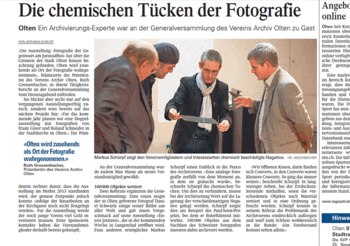 «Die Ausstellung ‹Fotografie der Gegenwart am Jurasüdfuss› hat über die Grenzen der Stadt Olten hinaus Beachtung gefunden. Olten wird zusehends als Ort der Fotografie wahrgenommen», bilanzierte die Präsidentin des Vereins Archiv Olten, Ruth Grossenbacher, in ihrem Tätigkeitsbericht an der Generalversammlung vom Dienstagabend zufrieden.Sie blickte aber nicht nur auf den vergangenen Ausstellungserfolg zurück, sondern wies bereits auf das nächste Projekt hin: «Für das kommende Jahr planen wir eine Doppelausstellung mit Fotografien von Franz Gloor und Roland Schneider in der Stadtkirche in Olten.» Die Präsidentin rechnet damit, dass die Ausstellung im Herbst 2013 stattfinden wird, der genaue Zeitpunkt jedoch konnte «infolge der Bauarbeiten an der Kirchgasse noch nicht festgelegt werden». Für die Ausstellung werde der noch junge Verein viel Geld investieren müssen. Erste Sponsorenkontakte haben die Vorstandsmitglieder deshalb bereits geknüpft.