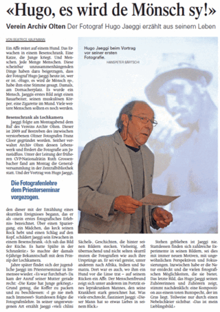 Beatrice Kaufmann schildert in der "Nordwestschweiz" vom 8. November 2013 die Begegnung mit Hugo Jaeggi. Der in Solothurn aufgewachsene Fotograf erzählte auf Einladung von Archiv Olten im Rahmen der öffentlichen Generalversammlung in der Zentralbibliothek Solothurn über seine Bilder und aus seinem Leben.