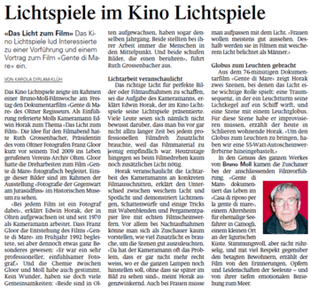 Aus dem 76-minütigen Dokumentarfilm «Gente di Mare» zeigt Horak zwei Szenen, bei denen das Licht eine wichtige Rolle spielt: eine Traumsequenz, in der ein Leuchtturm seineLichtkegel auf ein Schiff wirft, und eine Szene mit einem Leuchtglobus.Für diese Szene habe er improvisieren müssen, erzählt der heute in Schlieren wohnende Horak. «Um denGlobus zum Leuchten zu bringen, haben wir eine 55-Watt-Autoscheinwerferbirne hineingebastelt.» In den Genuss des ganzen Werkes von Bruno Moll kamen die Zuschauerbei der anschliessenden Filmvorführung. «Gente diMare» dokumentiert das Leben im «Casa di riposo per la gente di mare», einem Altersheim für ehemalige Seefahrer in Camogli, einem kleinen Ort an der ligurischen Küste. Stimmungsvoll, aber nicht rührselig, und mit viel Respekt gegenüberden betagten Bewohnern, erzählt der Film von den Erinnerungen, Opfern und Leidenschaften der Seeleute – und von ihrer tiefen emotionalen Beziehung zum Meer.