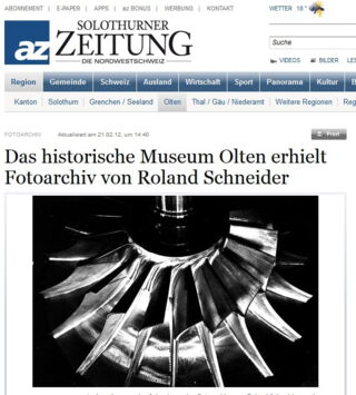 Nachdem im Dezember 2009 der Oltner Fotograf Franz Gloor (1948-2009) sein Bildarchiv der Stadt Olten geschenkt hatte, ist es nach kurzer Zeit nun auch dazu gekommen, dass die Fotoarbeiten des über die Landesgrenzen hinaus bekannten Solothurner Fotografen Roland Schneider, mit dem Franz Gloor seit 1972 über viele Jahre hinweg zusammengearbeitet hatte, nun ebenfalls als Schenkung an die Stadt gelangte.