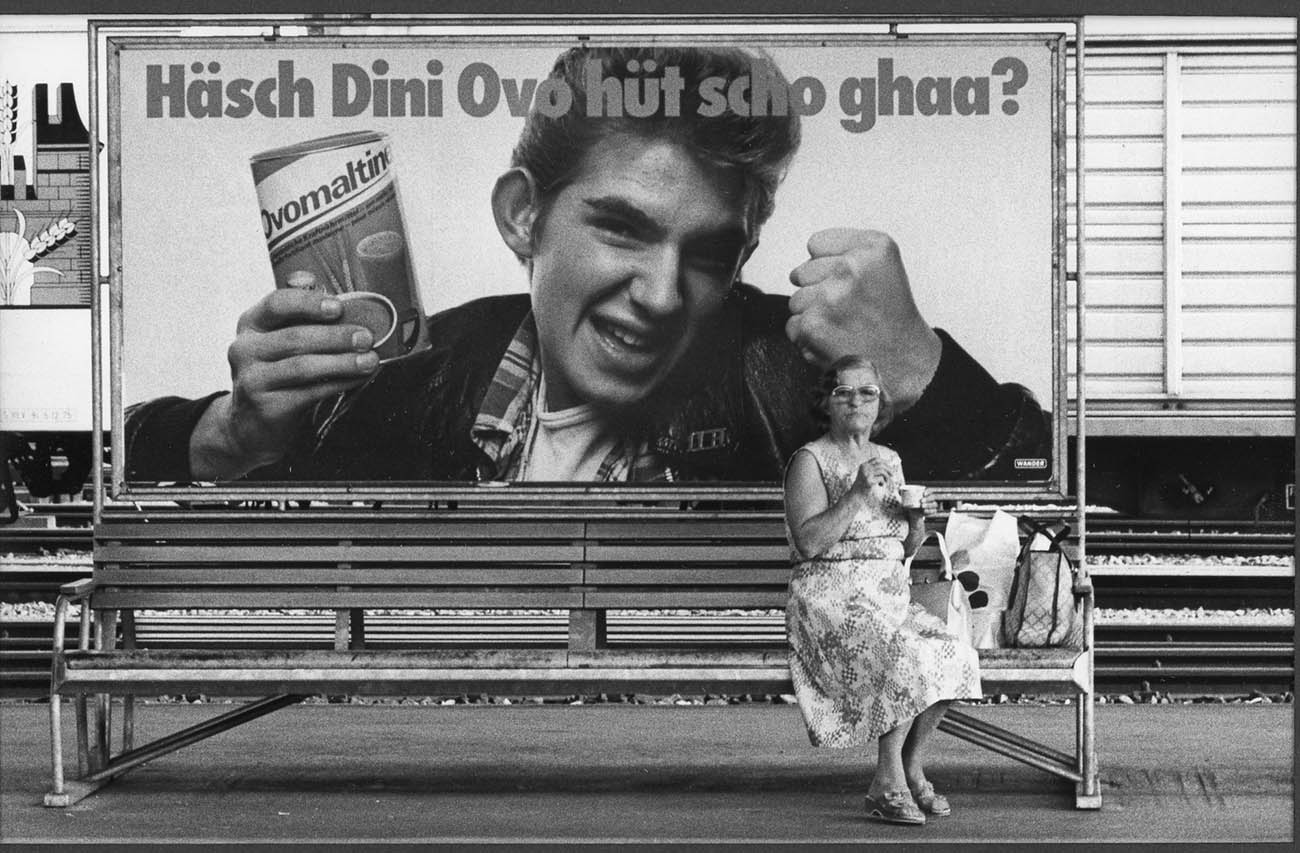 Hier haben zwei Fotografen den richtigen Moment erwischt. Jedoch auf ganz unterschiedliche Weise. Bis der junge Man sich so euphorische wie gewünscht dargestellt hatte, dürfte der Werbefotograf - oder auch die Werbefotografin - x-mal auf den Auslöser gedrückt haben. Für Hansruedi Riesen dagegen blieb, nachdem er die Situation erfasst hatte, nur der eine Moment, in dem die Frau verdutzt aufblickte. (Auszug aus dem Beitrag von Alois Winiger im Jahrbuch 2025, Foto Hansruedi Riesen, Copyright Historisches Museum Olten)